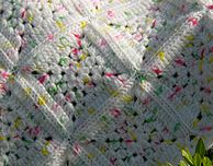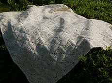 パターンは「銀麗60赤ちゃん特集」より。糸はカネボウベルベビーフルーレット。糸が気に入って衝動買いし、後で何しよ〜と本をめくって決めました。ベビードレスを編んでから編み始めたので、入院寸前から編みはじめて病院でも編んでいました。結局ベビーカーで出るようになった頃に完成し、現在もお昼寝の時に重宝しています。