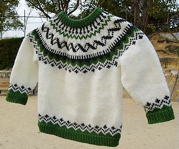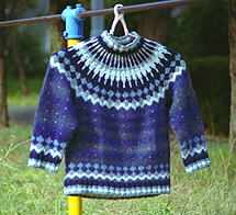 パターンは「アイスランドのロピーセーター」製図はオリジナル。糸はハマナカわんぱくデニスとかわいい赤ちゃん。本に載っていたのは大人サイズでしたが、糸を細くしたらそのまま子供サイズになりました。サイズは90(チビにあわせて胴が長く袖は短くしています)