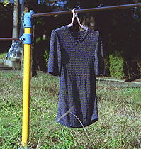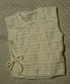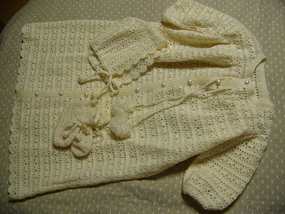 「こんにちは赤ちゃん」日本ヴォーグ社より。糸はスキーベビー中細。この本のパターンはたいへん凝ったものが多く、レトロ好きさんもベテランさんも気合いを入れて編める作品ばかり。おすすめです。しかし…途中で妊娠中毒症にかかってしまい、まともに起きていられなくなり出産ぎりぎりにやっと完成。なんとか退院の時着せることが出来ました。最近あまりドレスまで編む人いないなぁ〜