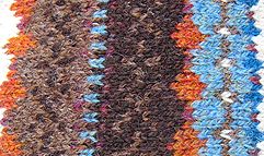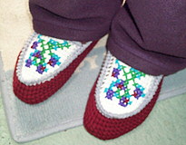 アフガン編みで編む室内ばきは昔はよくあったものです。この作者は室内ばき100点を集め展示会を開き、話題になった方です。実際作ってみると、私の足ではちょっと小さいみたいですぐ脱げてしまいます。和室向きでしょうか。私にはアクリル室内ばきの方が向いてるみたい。