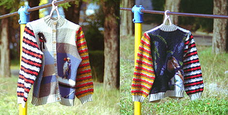 写真をスキャンし減色して、編み込んだかなり気合いの入ったものです。全部手編みです。編むのも大変でしたが、糸始末に2週間もかかりました(汗)