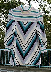 リッチモアエルデとプレアデスのしましま。リボンヤーンを使ったせいか着るたびに伸びてしまい、今ではとんでもない長さに(泣)