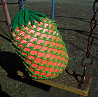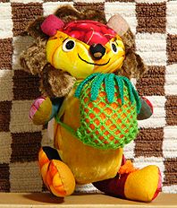 こちらのライオンは寄付用です。布はフルーツ柄を使っていてかなりど派手です。お腹につけているパイナップル、実は編み物でこのページ下にあるものと同じようなデザインですがサイズがたった8cm。極細糸を使いちまちまと編んでいます。もちろん中は取り出せます。ここだけオリジナル。