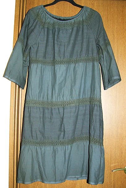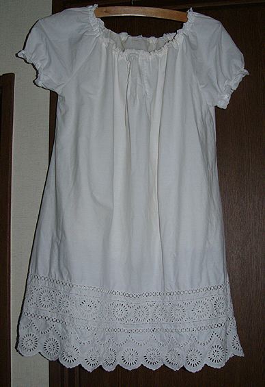 マキシ丈のバテンレースつきワンピ。20080814生地はウエダさんの綿麻楊柳、バテンレースはpres-deさんのイベントで購入、型紙はおなじみの19pスモック。わざと長めの丈にして晩夏モード。 |