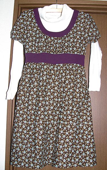 メルヘンちっくなワンピ。20080318パターンはshell buttonさん。今だと若干流行遅れですが、この形は好きなので縫いたかった。本来ニット用パターンですが、身頃にダブルガーゼを使い可愛い感じに。着脱も問題ありません。生地はCRAFT PUKUさんで買ったおそらくガーデンリングと同じメーカー。紫のリブはトミショウさんで頂いたおまけ。インに着せてる白タートルも自作です。 |
