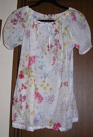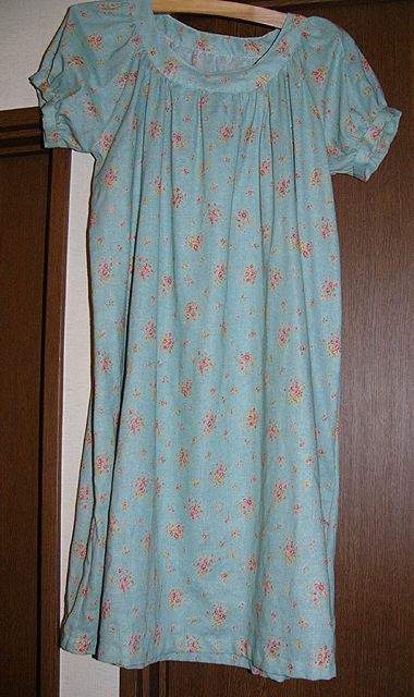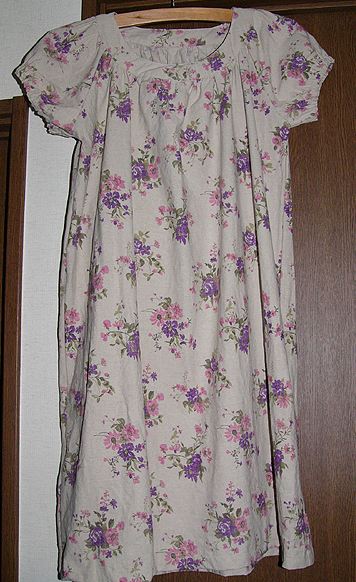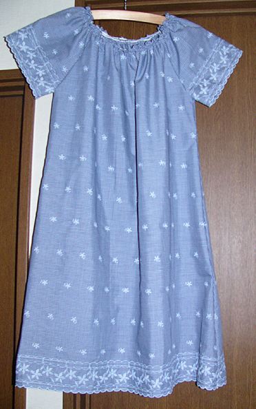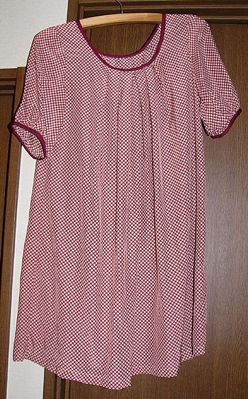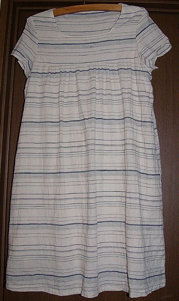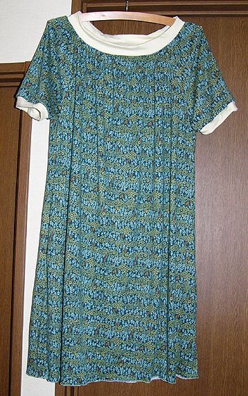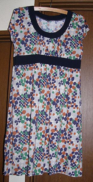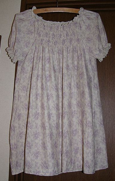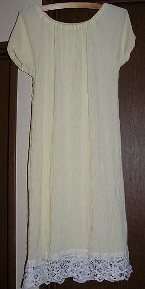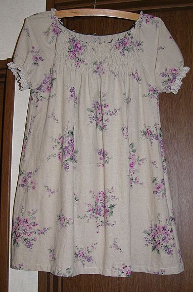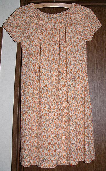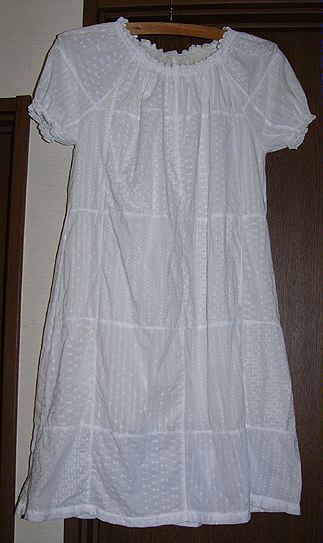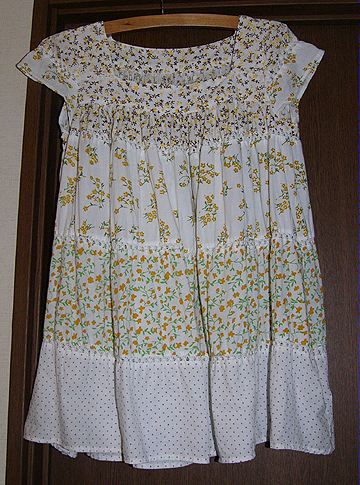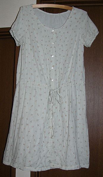かろやかな夏のワンピ。20080724生地はノムラテーラーさんのバーゲンで買ったボイル生地。パターンはブティック社「ガーゼリネンコットンの夏服」19pスモック。すそはロック処理、衿袖は簡単にゴムをたたきつけただけですが、いい感じに仕上がりました。 |