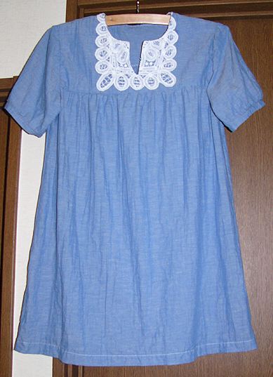 バテンレースをあしらったワンピ。 20080713生地はぽぷりさんのダンガリー。えりにHEALさんで買ったレースをあしらいました。レースを生かすために、シンプルな感じにしました。レースの長さに合わせるため、パターンも自分で起こしています。反省点は首が小さすぎること。頭が入るぎりぎりです。 |