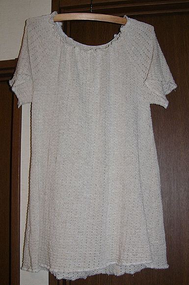 ナチュラルなカットソー。20080725生地はキバジの倉庫さんの綿麻透かし編み。糸が太いためロック処理でも糸がボロボロほつれてきます。首をゴムにしたのですが、重さで首が大きく伸びてきて実用には向かないです。かぎ針で処理した方が良かったかも。 |