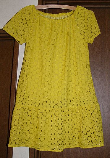 流行の黄色いワンピ。20080729ちまたで流行の黄色、刺繍生地。サークル刺繍ローン生地は大塚屋さん。裏地は近所で買いました。布を途中で買い足したので下がつなげてあります。。これもパターンはブティック社「ガーゼリネンコットンの夏服」19p。高級生地をカジュアルダウンというコンセプトで作っています。生地の取り方に悩んでしまい、これだけ2日かかってしまった。 |