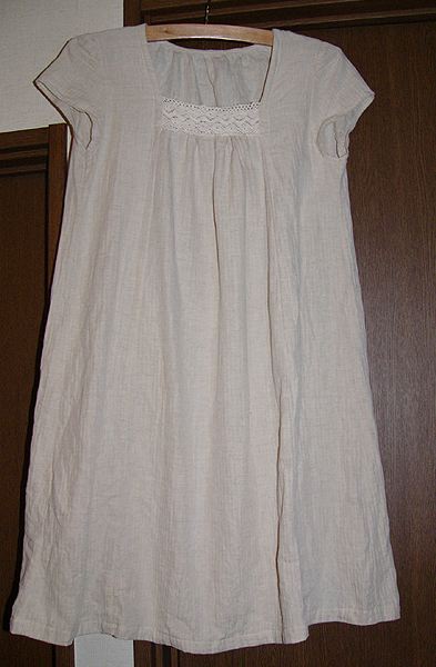 アンティーク風ジャーマンプリントワンピ。20080719生地は三宮のニッセイ商会で粘って値切った綿麻ダブルガーゼ。いい雰囲気です。そでに麻トーションレースをたたきつけアンティークな感じに。胸にシャーリングまでしています。 |