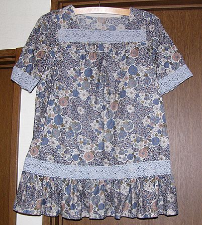エンパイヤラインのチュニック。200611これもパターンは同じ本の月居さんのものですが、これもやはりゆとりが多いですね。。布はクレヨンコットンさんで買った1重ガーゼ。レースは本当はピンクだったのですが、染めなおしました。アクリルだったようでなかなか染まらず苦労しました。 |