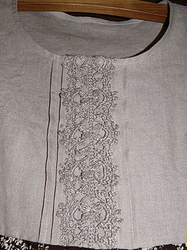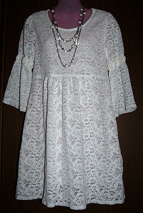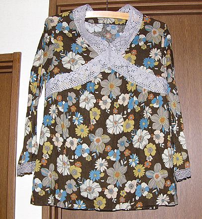 エビちゃんに近づきたい?コットンレースチュニック。20070702布は表裏ともユザワヤで買いました。月居良子「大人のクチュール ワンピースブラウススモック」を参考に、雑誌に載っていた服に似せるため大幅に寸法変更。しかし切り替え部分を下げすぎ、ちょいバランスが悪くなってしまいました。着た感じはトルソーとはちょっとちがうかな? |