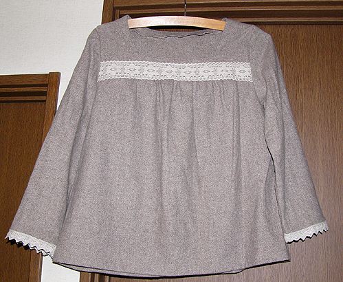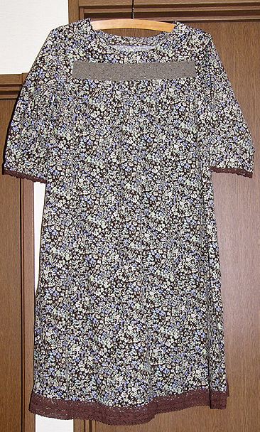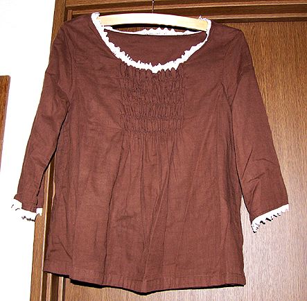 シャーリングスモックその2。200611同じパターンで。こちらはルシアンのダーラムキルトシリーズに、自分で染めた茶のレースをつけました。重ね着するとなかなかおしゃれです。 |