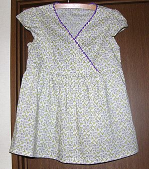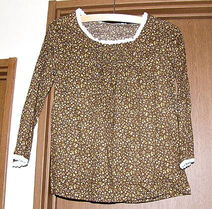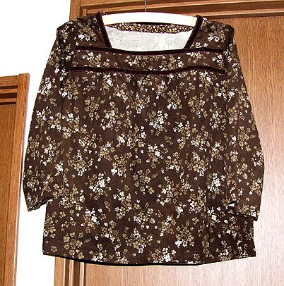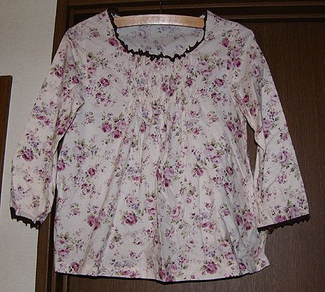 シャーリングスモックその1。200611これも上と同じパターンから作っているんですよ。ヨークをのばしてパターンを1枚にし、手前にシャーリングをかけました。布は1重ガーゼの花柄。どこで購入したか忘れました。。 |