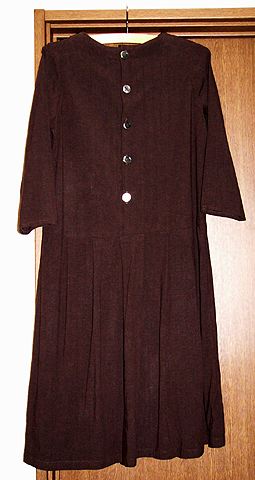 80年代風ワンピ2。20061120左と同じパターンで、背中をファスナーではなくボタンにしてみました。大人っぽくなった気がします。ただこちらは透けるので、スカートに裏地をつけています。布は同じくウエダさんで買ったリネンレーヨン。 |