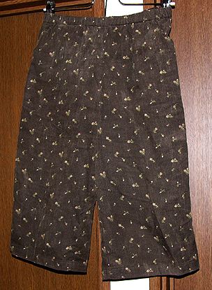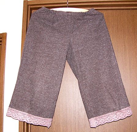 ウエストゴムの半端丈パンツ。200612布はリックラックさんのジャズネップフランネル。我ながらよく買えたと思う超人気の布。1枚でも暖かく肌触り抜群。レースは自分で染めたものを使っています。パターンは「ナチュラル素材の秋冬服」だったと思うのですが、ちょっと大きかった。 |