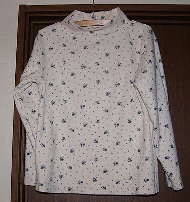 ダンボールニットのタートルネック。20070114布はソレイユさんで買った花柄。型紙は下のものと同じです。実は布が足りなくなったり、糸が途中でなくなっちゃったりしてすごい時間がかかってしまった服です。生地薄いから下に着れるかな〜? |