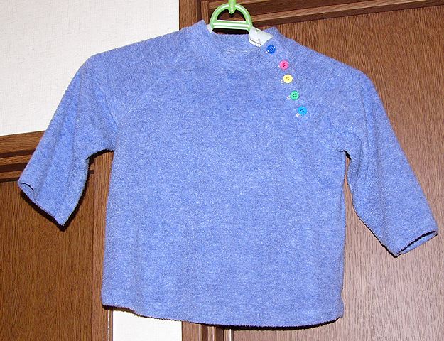 チビ用ラグラントレーナー。2007022690サイズです。布はリックラックさんのパイルニット。パターンはブティック社「かんたん手作りの赤ちゃん服」これです。袖側のトレースが裏側になっています。注意して作ってくださいまし〜。軽くて暖かいです。 |