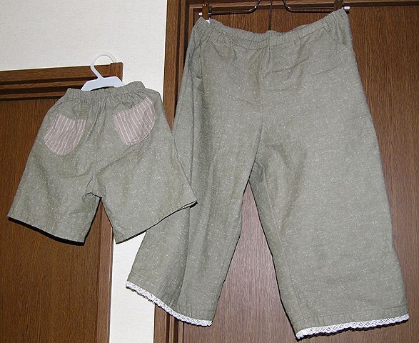 男の子とママのペアパンツ。20070814生地はenuno.comさんだったと思うのですが、麻にちっちゃい糸くずが混ざった変わった布です。パターンは母が「ナチュラル素材の秋冬服」チビは「ママとこどもナチュラルテイスト秋冬服と布こもの」の100サイズ。母子ともにサイズ少し大きめですが、夏はゆったりの方が気持ちいいです。私のは穿き心地最高。でもレースがひざに当たってかゆい(笑)チビのポケットもかわいいでしょ? |